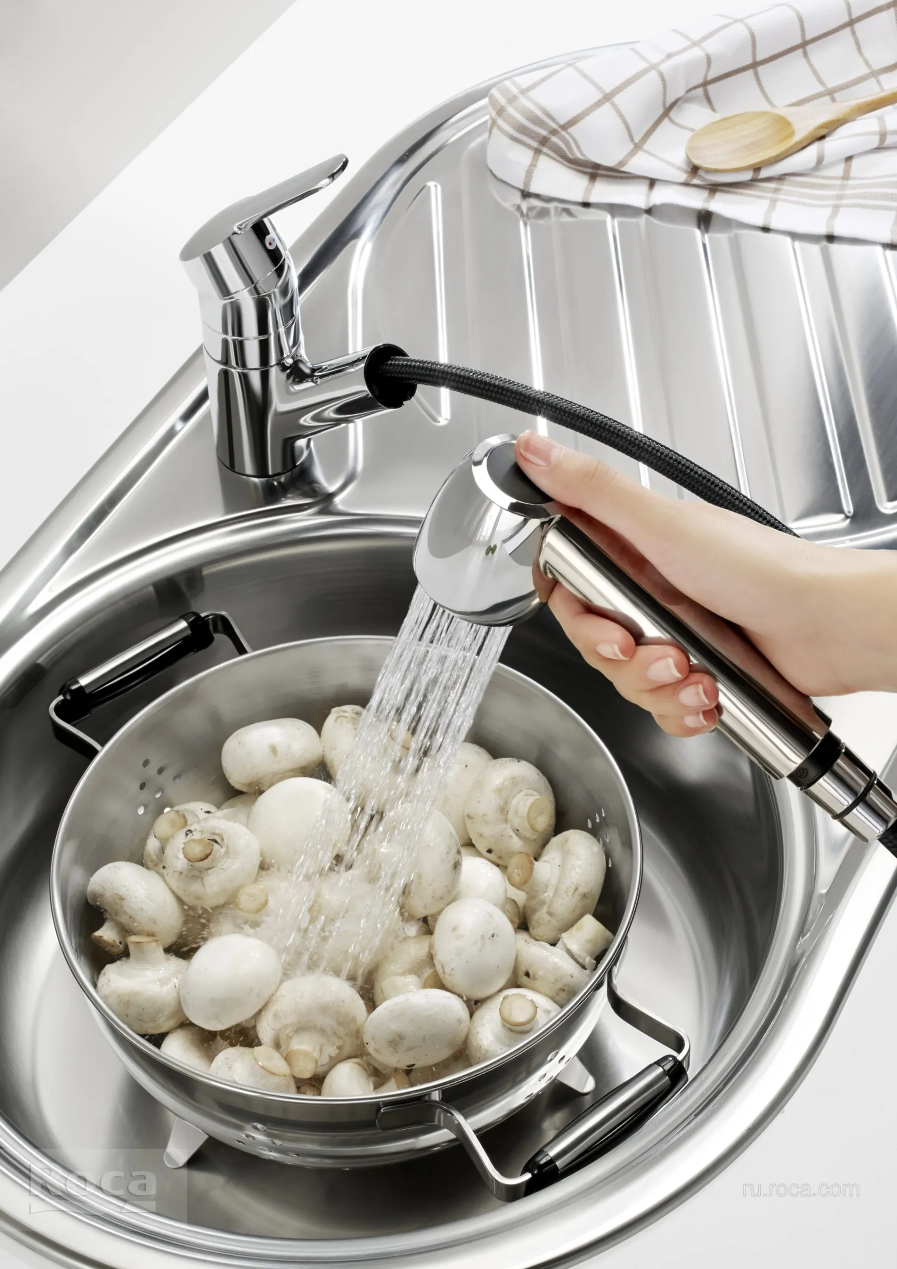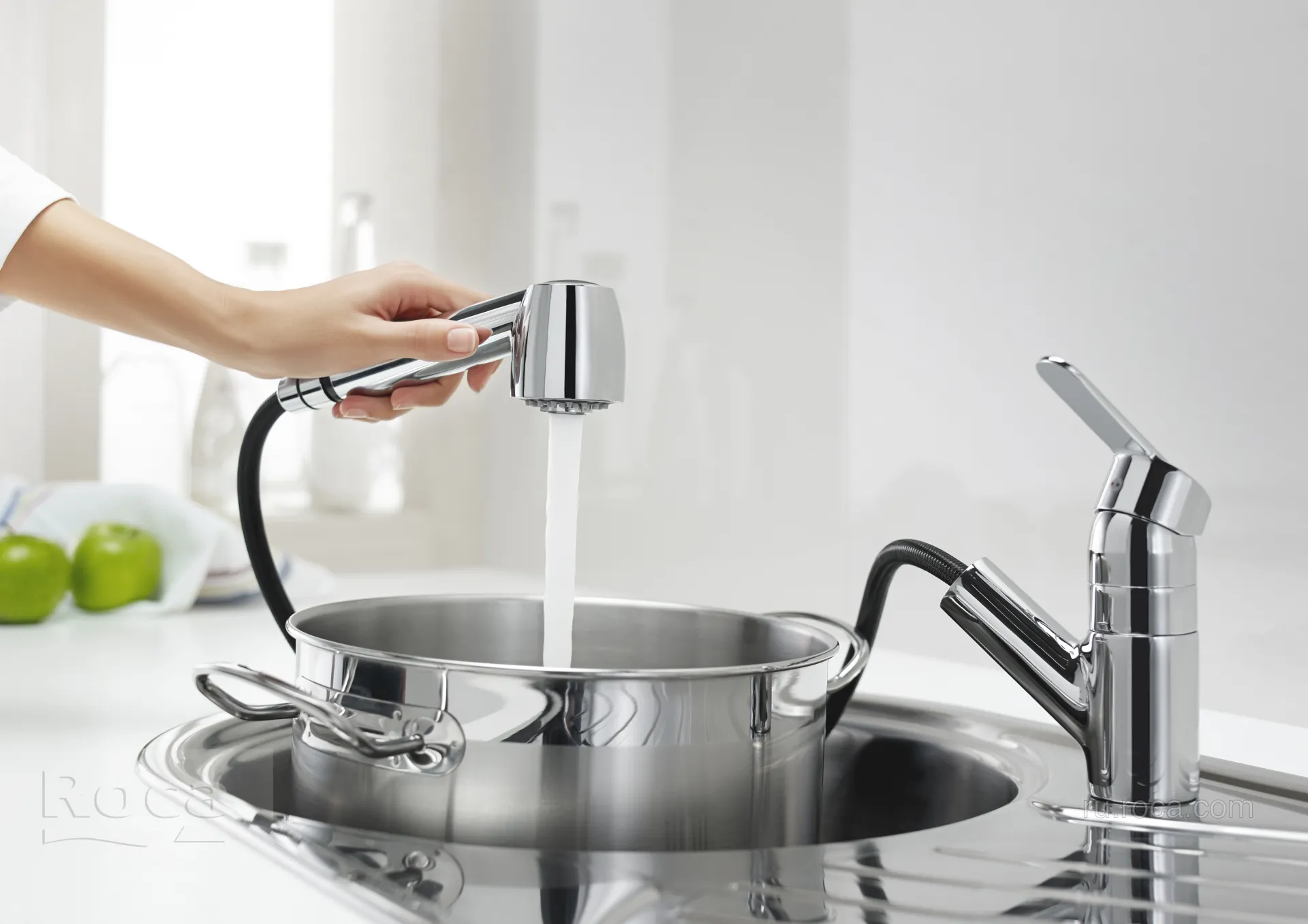Roca Victoria Смеситель однорычажный для кухни с выдвижным 2-х режимным душем, поворотный, хром